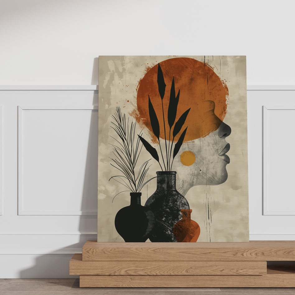 Ajoutez une touche artistique minimaliste et contemporaine à votre intérieur avec ce tableau abstrait en toile canvas. Il représente un profil de visage stylisé, un soleil orangé et des vases floraux dans un jeu de formes et de contrastes subtils